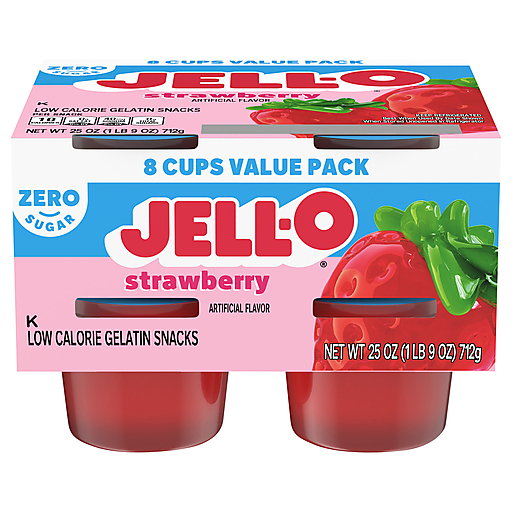 Jell-O Zero Sugar Strawberry Artificially Flavored Gelatin Cups deliver the great taste of Jell-O Gelatin in a low-calorie choice. Our delicious on-the-go gelatin comes in individual snack cups, perfect for putting into a lunchbox or snacking at home. Zero Sugar artificially flavored strawberry gelatin is fat-free and contains 10 calories per serving. Great for those keeping Kosher. Each family size 25-ounce sleeve contains eight Jell-O Zero Sugar Strawberry Artificially Flavored Gelatin Cups for quick and easy snacking.